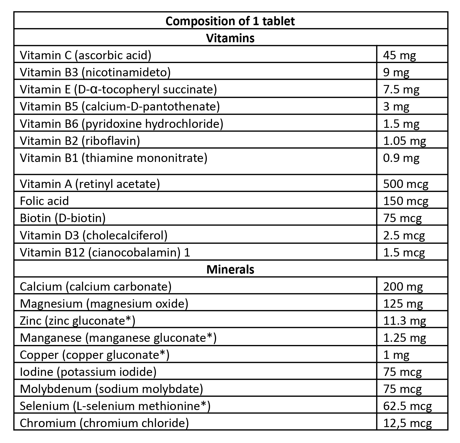 Pharmacological properties: New Nordic new generation multivitamin complex uses innovative, microencapsulation method, which eliminates metabolism among the contained active substances of a tablet and increases their effectiveness. Thanks to microencapsulation, natural components are being released gradually and prolongedly restore vitamin and mineral balance in body, preventing hypovitaminosis and avitaminosis. Multivitamin optimal complex contributes to female appearance as well as internal health at all ages and conditions.