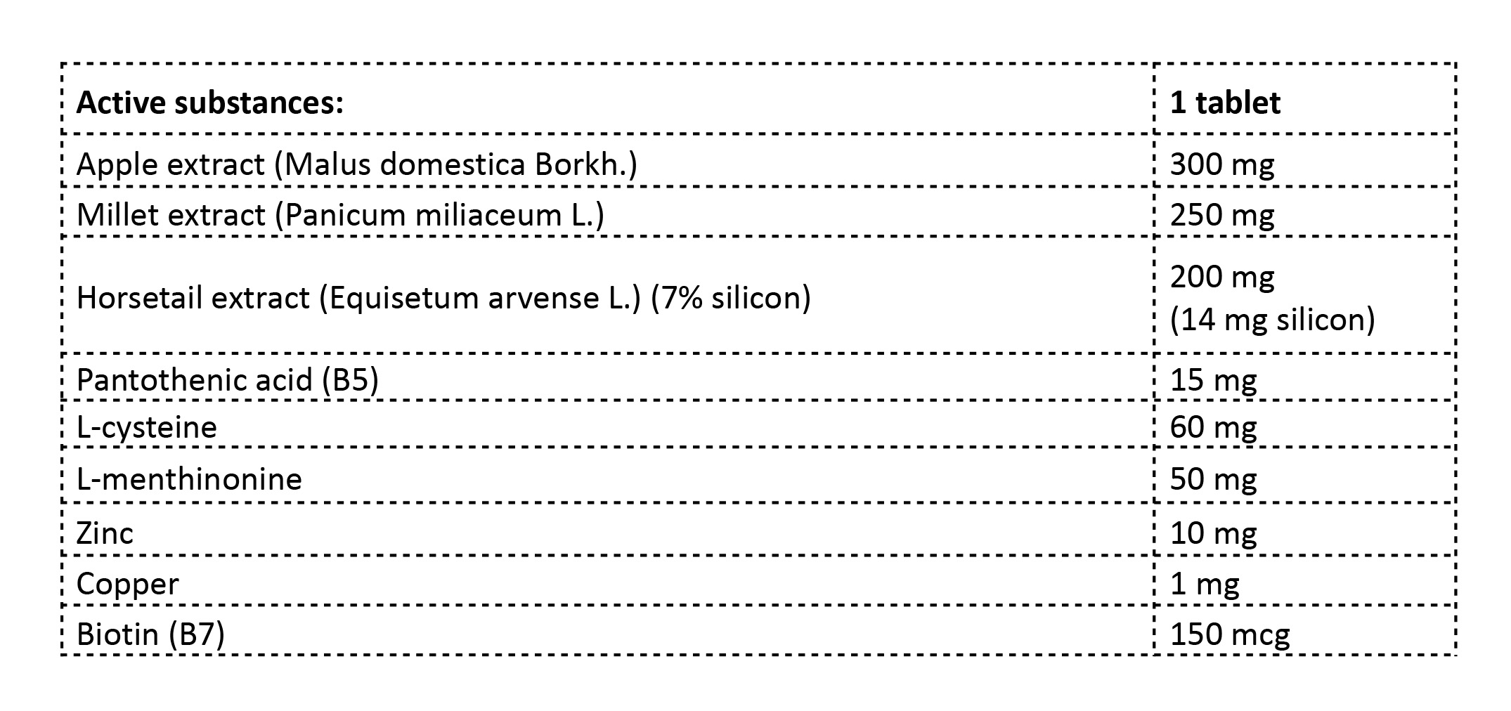 Pharmacological properties: apple extract – contains natural growth factor – proantocianidine B2, which stimulates hair epithelial cells and accelerates hair growth in follicles. Millet and horsetail extracts – millet extract contains large quantity of miliacin, while horsetail extract, in comparison with other plants, has the highest concentration of natural mineral – silicon. These two substances are necessary for hair roots. They stimulate hair growth, maintain its volume, strengthen hair roots. Biotin and pantothenic acid are group B vitamins, participating in metabolism of skin barrier and hair follicles. They stimulate normal hair growth. Are responsible for skin and nails beauty. Copper – necessary for hair pigmentaion, helps maintaining natural hair color, prevents from premature graying. L-cysteine – is an amino acid, a part of keratin – protein essential for hair strength and elasticity.